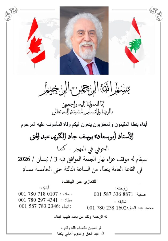 وإننا في هذا المصاب الأليم، نتقدّم من عائلته الكريمة، ومن أبناء الجالية اللبنانية في كندا، بأحرّ التعازي وأصدق مشاعر المواساة، سائلين الله تعالى أن يتغمّده بواسع رحمته، ويسكنه فسيح جناته، وأن يلهم محبّيه الصبر والسلوان.